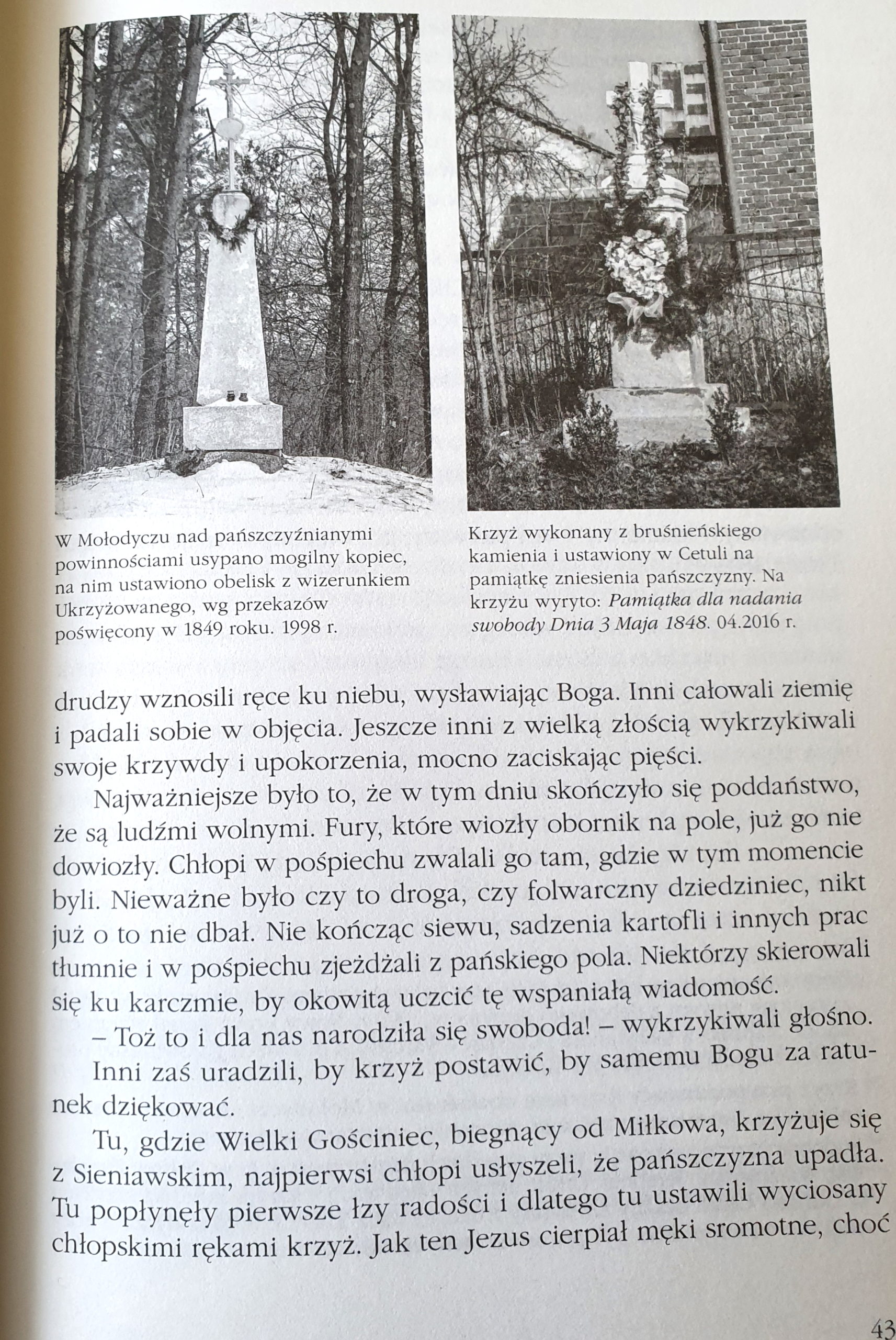 W książce znajduje się też także informacja, że znajduje się tam kamienny krzyż postawiony na pamiątkę zniesienia pańszczyzny. Stał na początku wsi i postawiony prawdopodobnie był na miejscu starszego derwnianego. Fundatorem był Teodor Terenieniec. Prawnukowie Teodora żyją w Wałczu, Jaworze, Jelonkach koło Pasłęka i Katowicach.