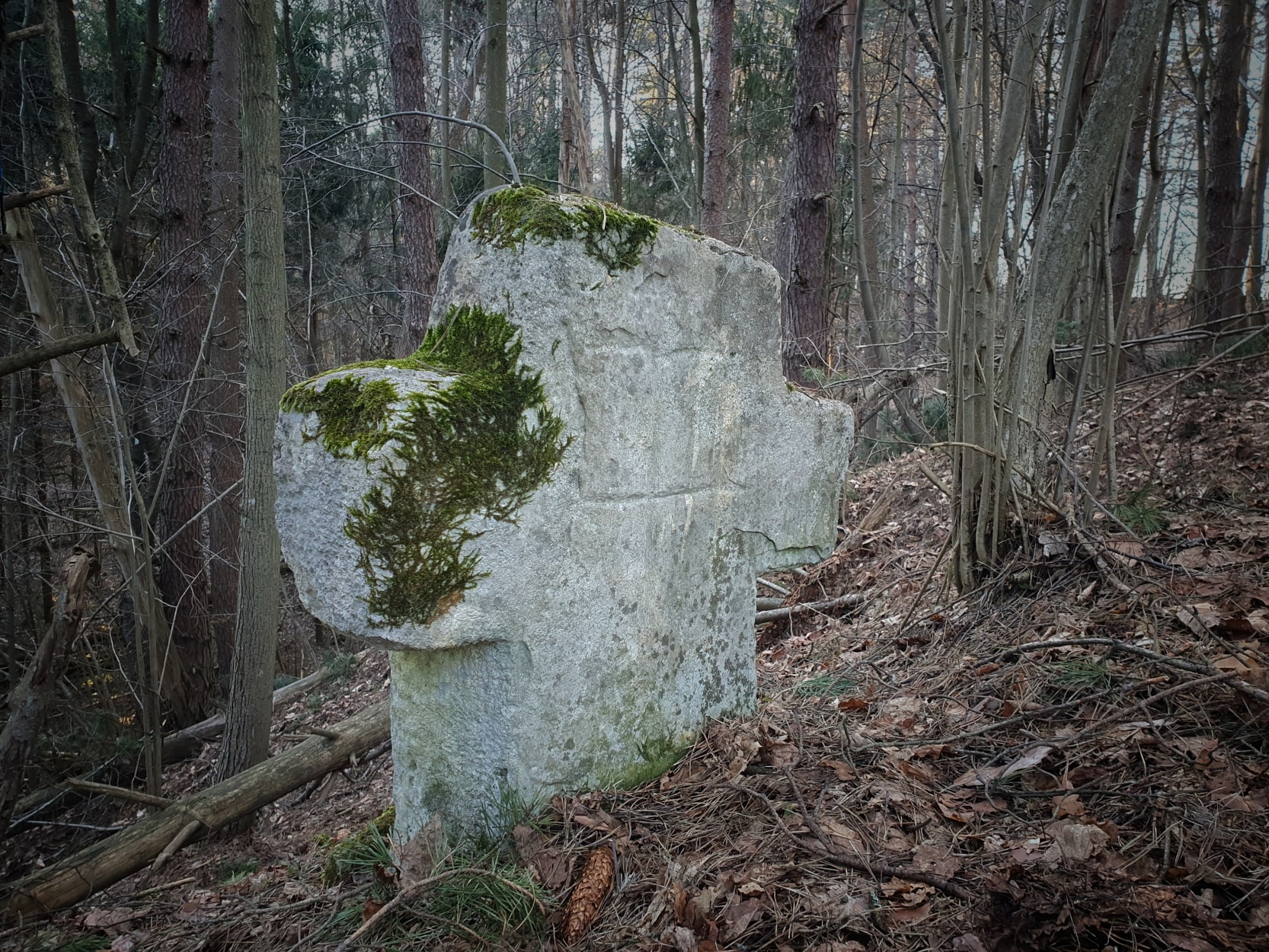 Przemieszczamy się do drugiego miejsca około 400 metrów dalej na zachód. Czeka na nas usytuowana nad debrą, leżąca kamienna karawaka. Nasz cel to postawienie jej. Odsłonięcie jej z ziemi nie było trudne, zajęło nam to zaledwie chwilę. Przy okazji możemy zobaczyć, jak wygląda typ najstarszego krzyża bruśnieńskiego. Dzięki notatce z 1904 roku, sporządzonej przez Karola Notza, który podróżował przez ten region, wiemy, że krzyż ten pochodzi z okresu najazdów Tatarskich. Wtedy pojawiały się pierwsze kamienne krzyże na mogiłach. Chyba wszyscy czujemy jego wartość historyczną. To jeden z najstarszych bruśnieńskich krzyży. Strażnik historii, którą właśnie od nowa odkrywamy. Gdy tak leży odsłonięty i widać go w całej okazałości, możemy podziwiać, jak został wykonany. Jest to poluch, czyli duży kawał kamienia, wykopany na polu z Kamiennej Góry (tak nazywano okolicę bliską obecnej Hrebcianki). Widać część trzonu kamienia, która miała być pod ziemią. Nie była obrabiana, ma nieregularny kształt. Obrabiano tylko to, co miało być na powierzchni. Na jego licu znajduje się wyryty krzyż z dobrze zaznaczonymi dwoma belkami, wygląda na to, że to karawaka. Tego typu krzyże miały chronić ludzi przed zarazą i czarami. Zazwyczaj zaraza pojawiała się po najazdach Tatarskich, kiedy panował też głód. Osłabieni i wygłodzeni ludzie byli szczególnie podatni na choroby. Miejsce dla tego krzyża jest niezwykłe, nad samym skrajem debry. Być może była tu mogiła, ale poniżej, może w jakiejś jaskini w skarpie debry? W okolicy Góry Brusno znajduje się sporo różnych szczelin i małych jaskiń. Krzyż ten znajdziemy na mapie z 1854 roku, stoi na granicy pól. Na wschód od krzyża usytuowana była karczma, a zabudowania gospodarzy były niżej, przy drodze. Ciekawe i tajemnicze miejsce.